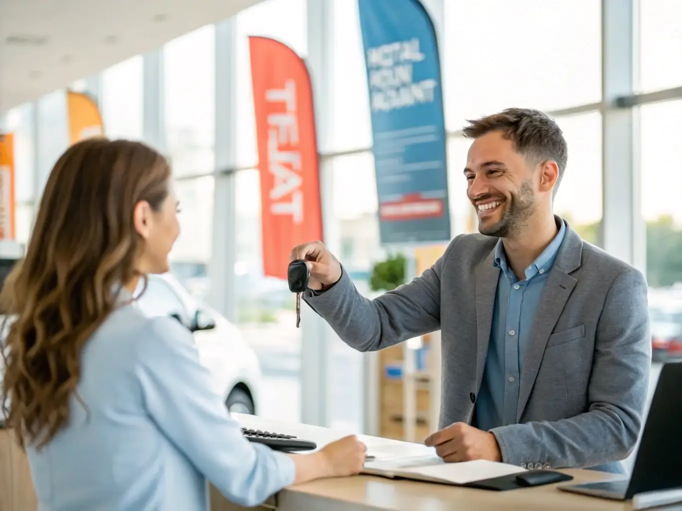 A modern car rental office with a customer receiving keys, showcasing Soltrice's application in preventing fraud in car rentals.